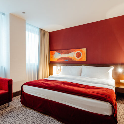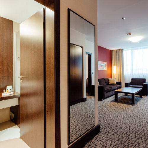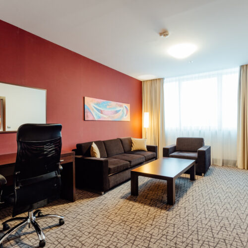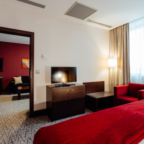 Navodzuje pocit pohodlia a vzhľadom na svoju rozlohu je ideálnym miestom pre náročnejších hostí a dlhodobé pobyty. V porovnaní s EXECUTIVE izbou si navyše môžete dopriať king-size lôžko pre dve osoby, obývaciu časť a druhú LCD obrazovku.